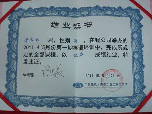 圖7 李冬冬同志以優(yōu)異的成績榮獲英語結業(yè)證書——是各位同志學習的楷模