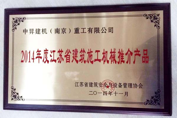 2014年11月,中昇建機(南京)重工有限公司以一如既往的優(yōu)異表現(xiàn)被江蘇省建筑安全與設(shè)備管理協(xié)會評為“江蘇省建筑施工機械推介產(chǎn)品”榮譽稱號,并頒發(fā)獎?wù)隆?