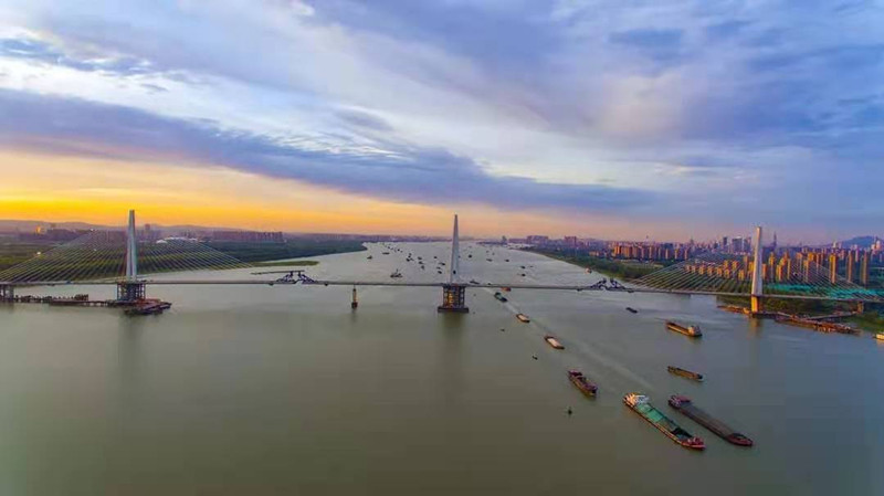 大橋主橋為輕型鋼混結(jié)構(gòu)斜拉橋,線路全長10.3千米,橋梁總長4.4千米,主橋長1796米,南北主跨長1200米;橋面為雙向六車道城市主干道,設(shè)計速度100千米/小時。大橋整體分為橋梁段、路基段和隧道段三部分,橋梁段由北至南分別由北引橋、北主橋、南主橋、南引橋四個部分組成。
