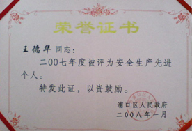 祝賀我司員工王德華組長(zhǎng)榮獲浦口區(qū)2007年度安全生產(chǎn)先進(jìn)個(gè)人 2008-05-07 |